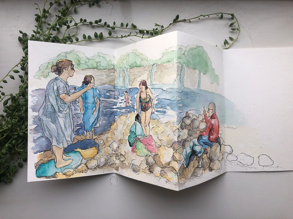 On arriving in a little Swaledale village named Keld I was greeted by the smiling faces of the friendliest group of women who had travelled north to experience the waters of Swaledale. I first swam in Keld almost a year ago, so I was familiar with this stretch of river and I was excited to capture the experience of the group discovering the water for themselves. We walked along the River Swale to the first waterfall Kisdon Force, a series of waterfalls 500 metres downstream from Keld. I joined the group for the first 'dip' (it would be rude not to!) but I lasted a lot less time in the water than this hardy group of women. As they continued to enjoy the water, I sat at the river's edge and sketched.